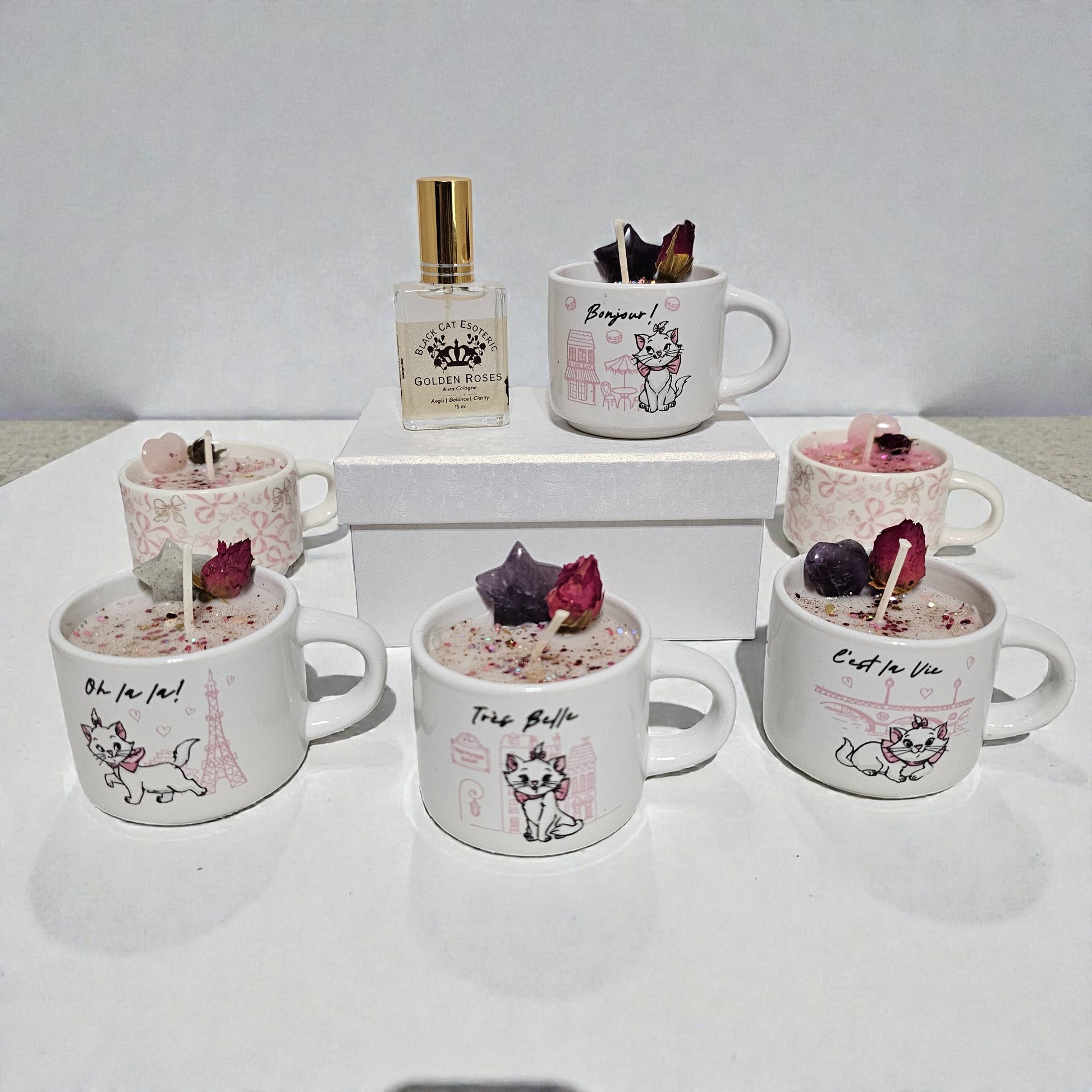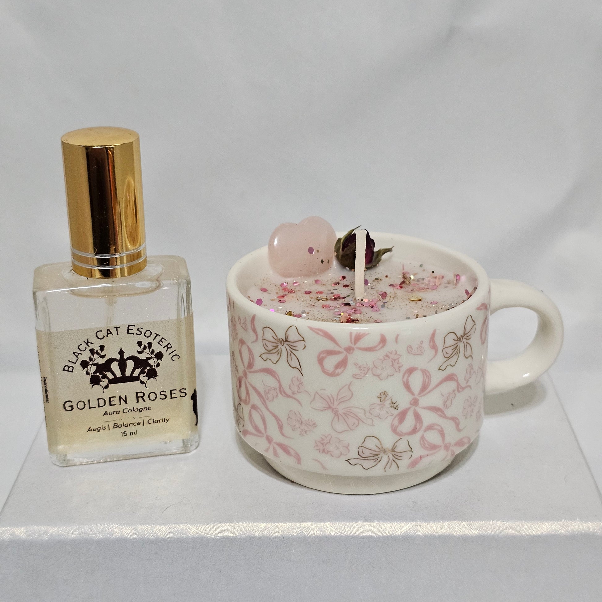 A collectible espresso cup candle crowned with real crystals, paired with Golden Roses aura cologne. Limited to 18 one-of-a-kind sets.